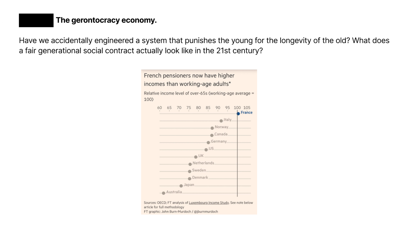 In France, the average income of pensioners now surpasses that of the working-age adults subsidizing them. The resulting pensioner democracy routinely favors the old at the expense of the young.