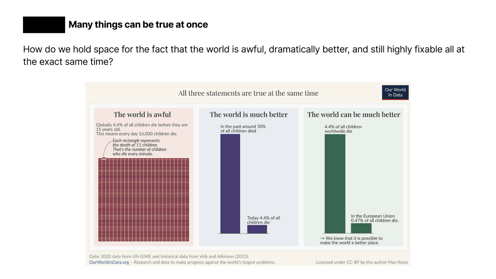 The final chart of the evening reframed everything that came before it. The world is, by almost every measurable dimension, better than it has ever been. And yet 16,000 children still die every day, and those deaths are very unevenly spread across the globe. All of those things are true at the same time.