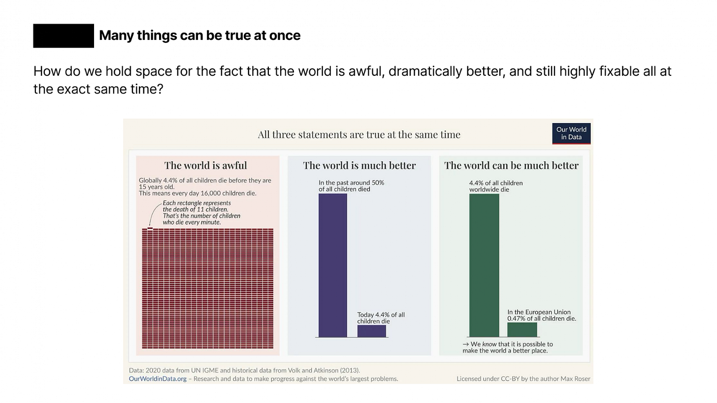 Awful, better, fixable. The world is devastating and better than it has ever been. Our inability to hold both truths is what keeps us stuck.
