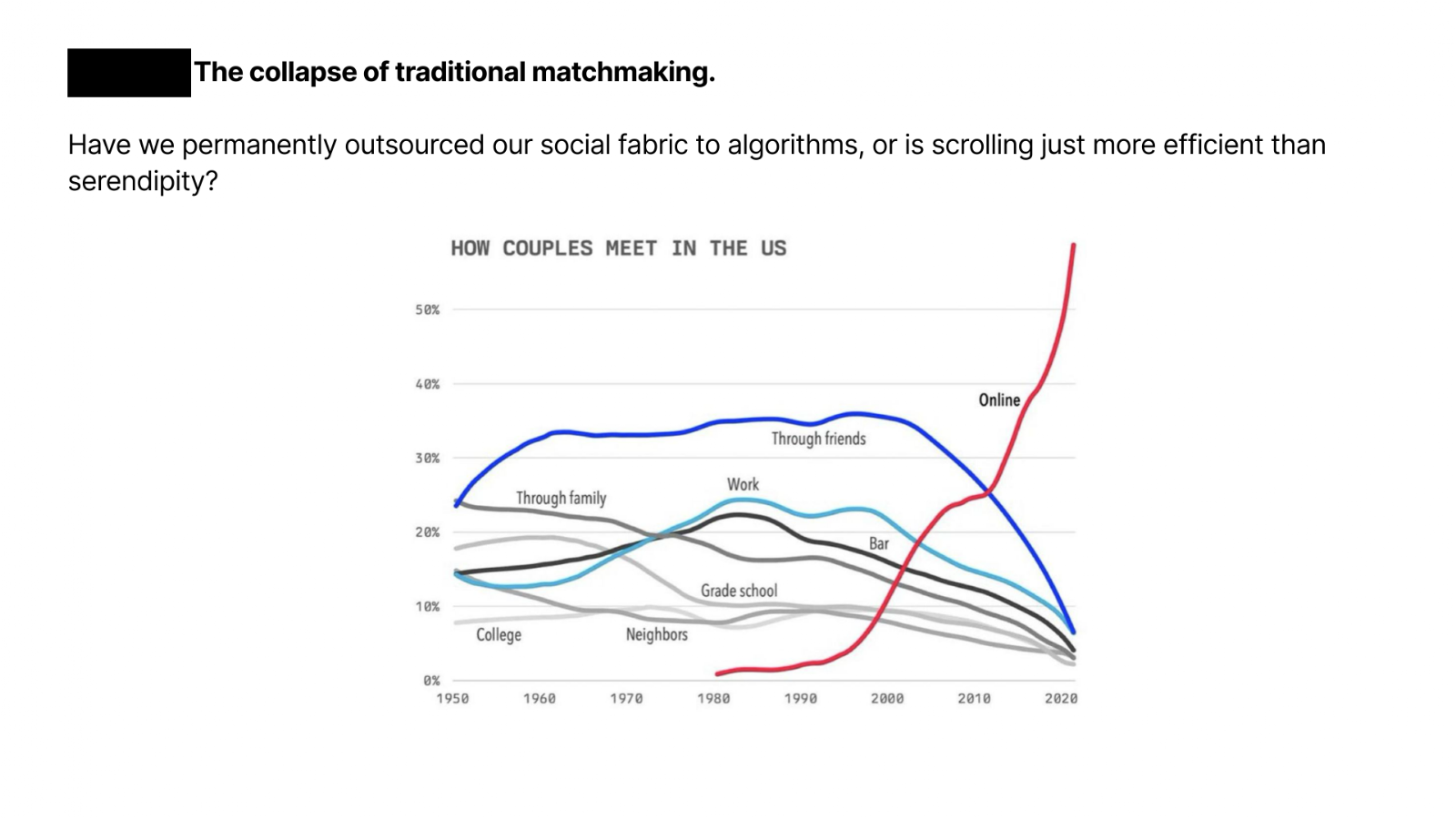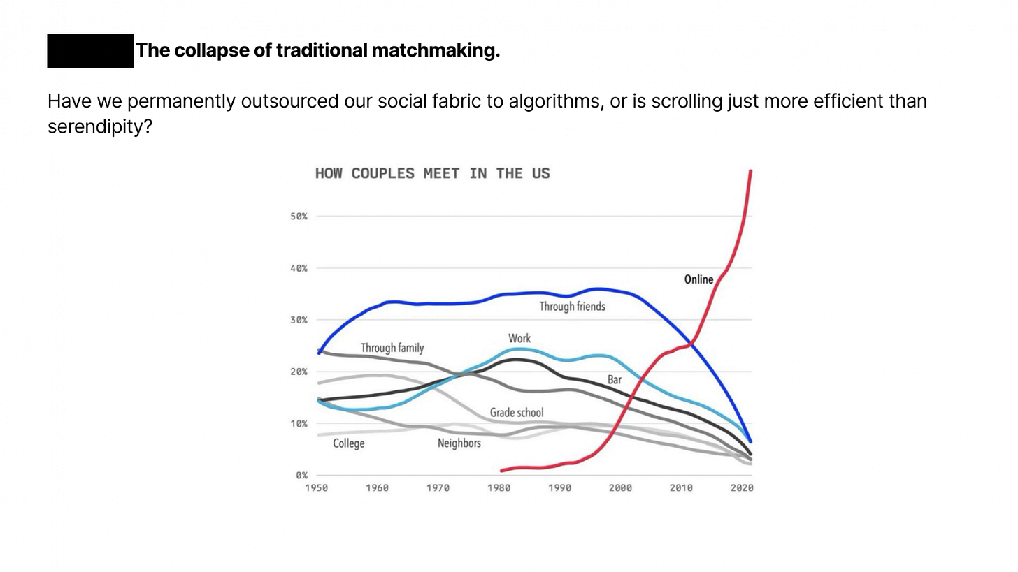 By 2020, 50 percent of US couples met online, overtaking every traditional avenue of human connection combined. The decline of institutional religion and physical third spaces opened a social void that dating apps rapidly filled. But infinite digital abundance has paradoxically engineered widespread isolation and swipe fatigue.