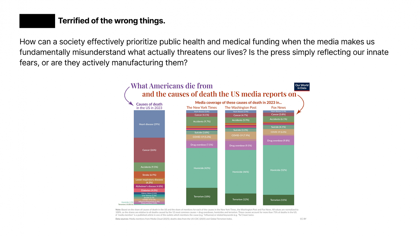 Misallocated fear. Heart disease causes 29% of US deaths and gets 2% of media coverage. Homicide and terrorism dominate the headlines.