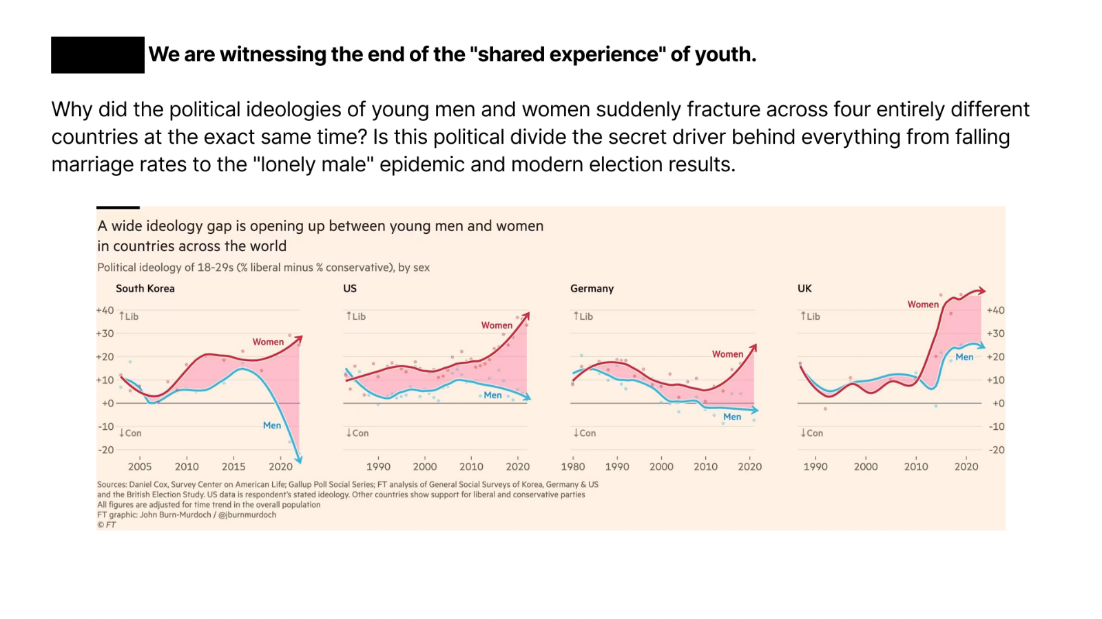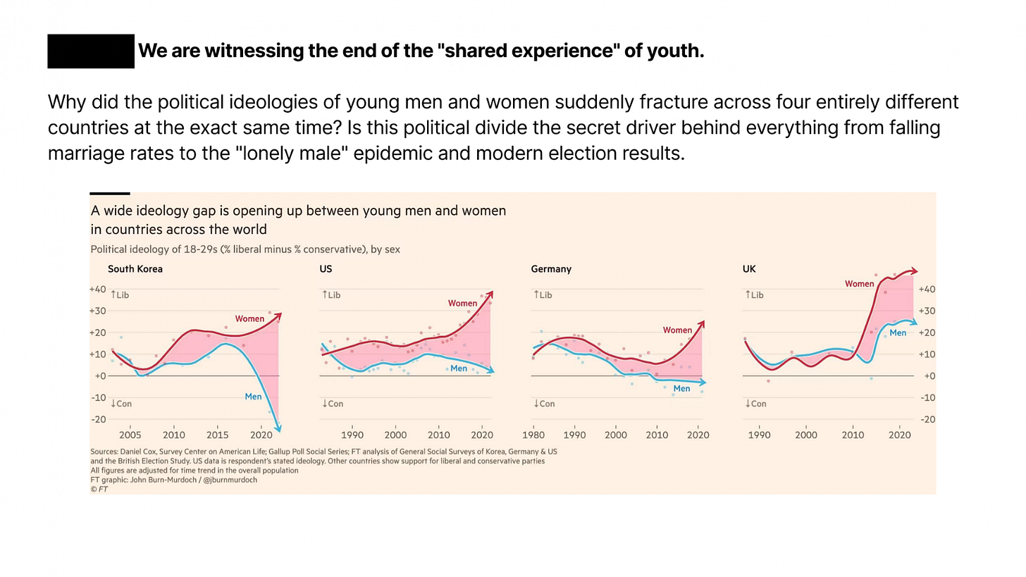Financial Times data reveals a political chasm opening between young men and women across the globe. In the US, UK, and Germany, young women are now roughly 30 points more liberal than their male peers. In South Korea, the gap approaches 40 points, and we’re seeing the rise of the 4B movement, where women reject marriage entirely.