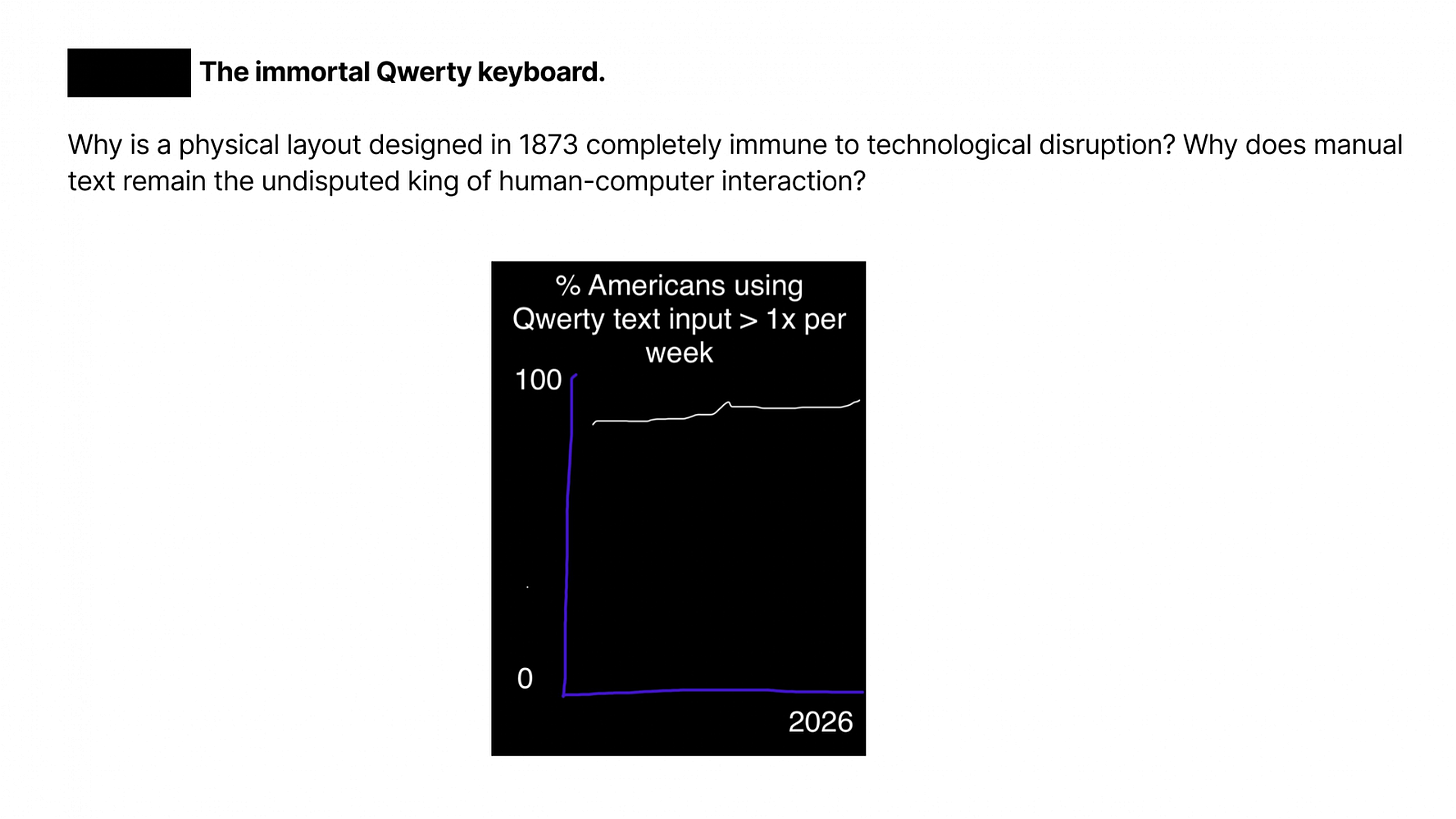 We have had touchscreens, voice assistants, gesture controls, and styluses. Yet the primary way humans communicate with computers is still typing text on a layout designed in 1873.