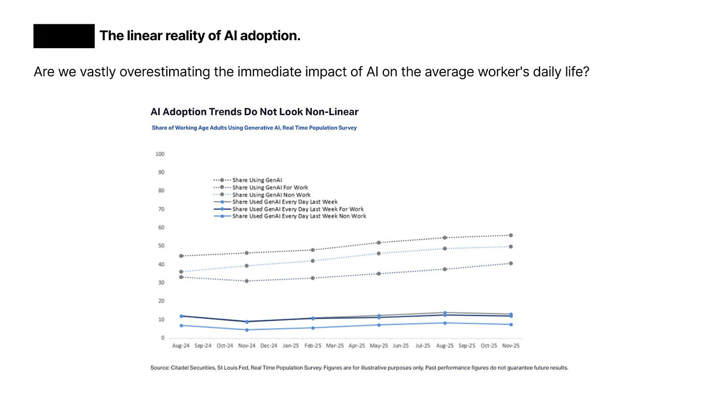 AI adoption: flatlined. Daily AI use at work is growing more slowly than headlines suggest. Compliance, energy, and institutional inertia are winning.