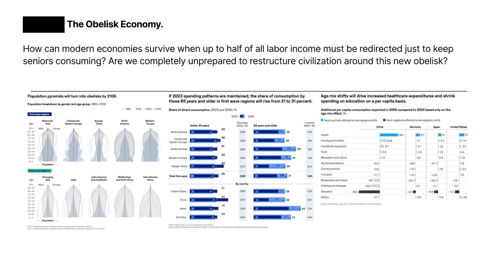 By 2100, population pyramids will flatten into obelisks, with numbers roughly equal across all age groups. In Western Europe, the share of consumption driven by people 65 and older is projected to jump from 21 to 31 percent by 2050. The UN predicts global population will begin declining in the 2080s.