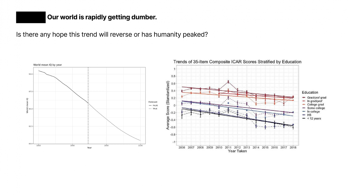 Long-term tracking data shows global IQ scores trending downward, effectively ending the 20th-century Flynn effect of constantly rising intelligence. The group debated root causes: selection bias in who takes online tests, the delayed toll of historical lead poisoning and environmental exposure, or the more uncomfortable theory: that this is the biological cost of screen addiction and outsourcing memory to smartphones.
