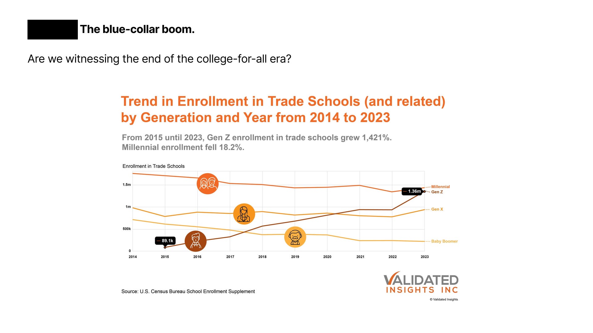 The toolbelt generation. Trade school enrollment surged 1,421% as youth bet their unautomatable hands against the laptop class.